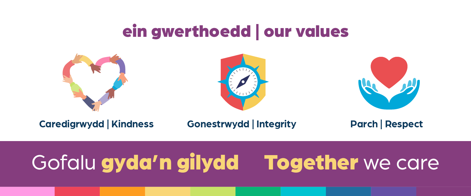 Mae ein gwerthoedd yn llunio sut rydym yn gofalu a sut rydym yn gweithio. Maent yn ein helpu i adeiladu diwylliant o garedigrwydd, gonestrwydd a pharch – i’n gilydd a’r rhai rydym yn eu gwasanaethu.