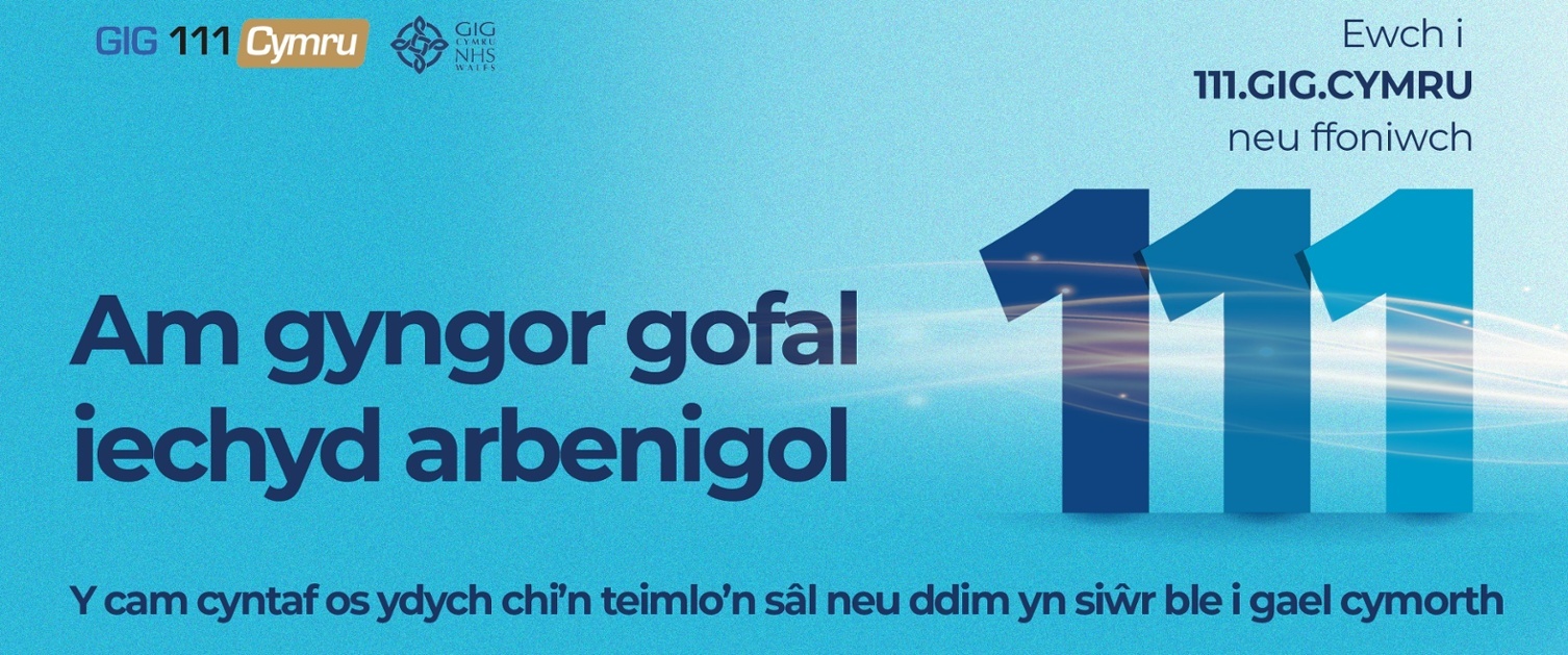 Ffonio 111 o unrhyw linell dir neu ffôn symudol (am ddim, hyd yn oed os nad oes gennych gredyd). Am Gymorth Iechyd Meddwl Brys – PWYSWCH OPSIWN 2