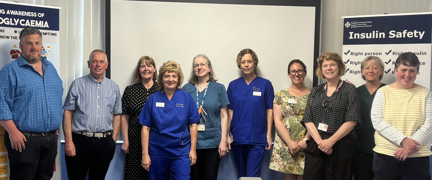 Wrth goffáu'r achlysur gyda digwyddiad arbennig, dathlodd tîm Diabetes yr ysbyty gyda'i gilydd ac ymunodd y rhai y cyfrannodd eu rhoddion at y cyfleuster â nhw - y teulu Bowen, sy'n noddwyr Ymddiriedolaeth Wendy Bowen, ac aelodau o elusen Cynghrair y Cyfeillion.